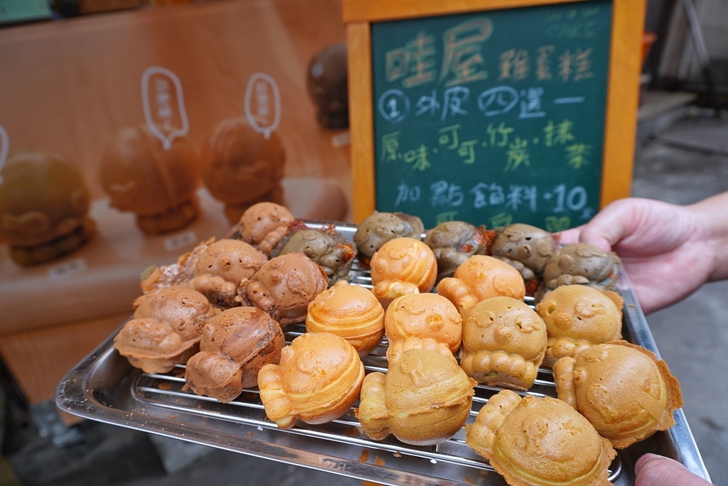 台中西屯美食<哇屋雞蛋糕>位於逢甲文華路的巷弄小道內,外皮有四款口味可挑選、內餡也可以自由搭配,現烤五分鐘就有熱呼呼美味可口的雞蛋糕了