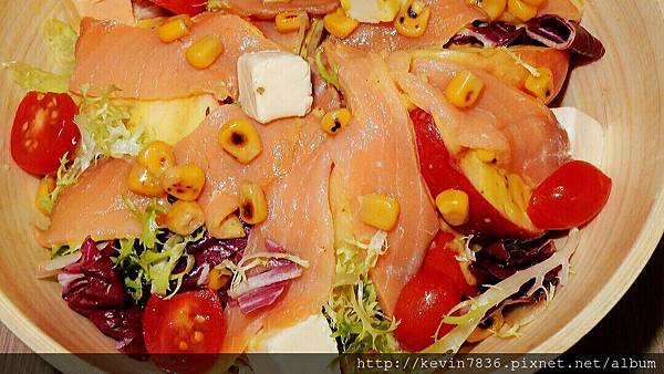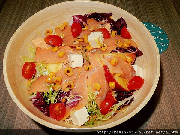 這鮭魚肉質超細緻,梅子細數一下沙拉裡有鮭魚.蘋果.番茄.起司球.甜椒.高麗菜絲等等超豐富料理