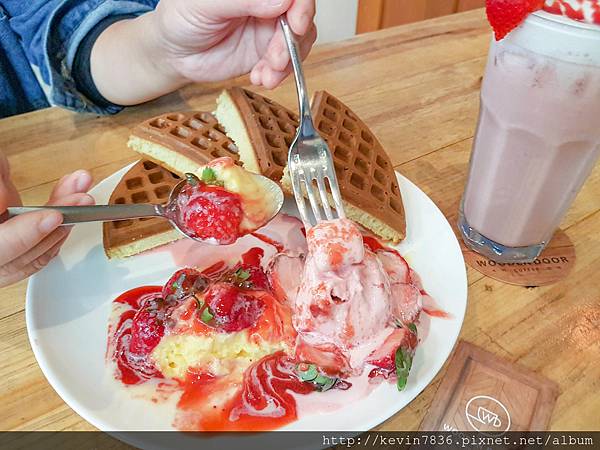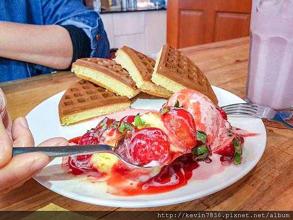 鮮草莓冰淇淋鬆餅~果真,每顆草莓都大大顆來的,當果肉吃進嘴裡時,我的味蕾整個瀰漫著草莓誘人甜甜香氣,再搭上鬆餅,整個就豐盛極了