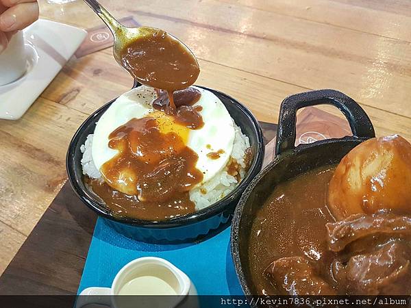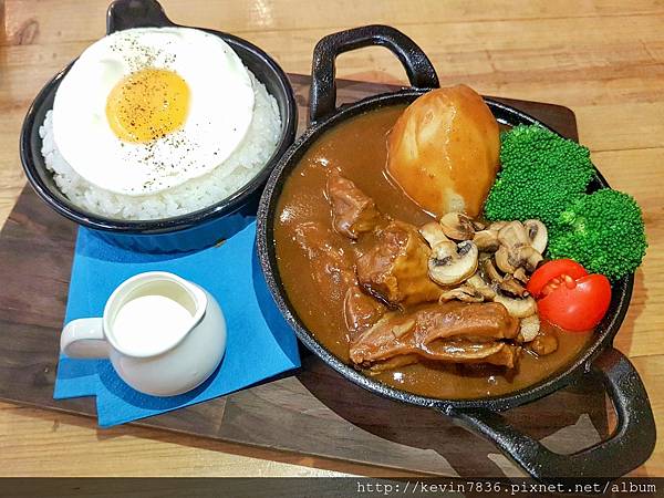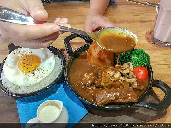 私房咖哩牛腩飯~一上桌就聞到咖哩香噴噴的味道,細數一下有花椰菜.馬鈴薯.蘑菇與番茄,當然還有大塊紮實口感的牛腩,開動