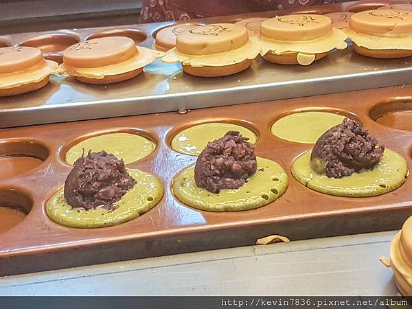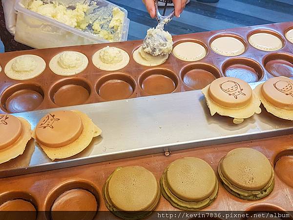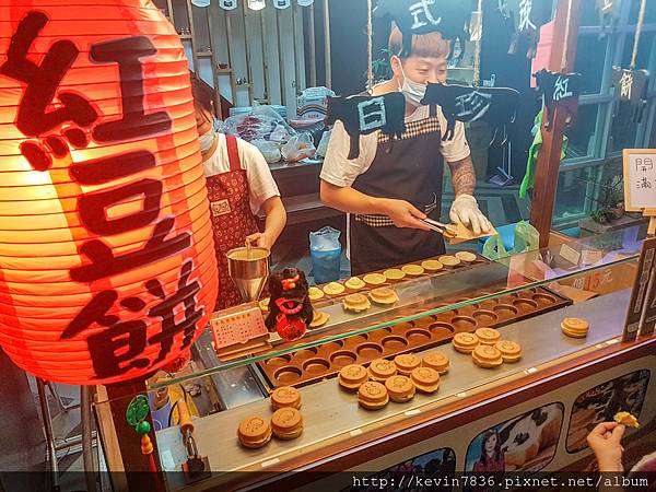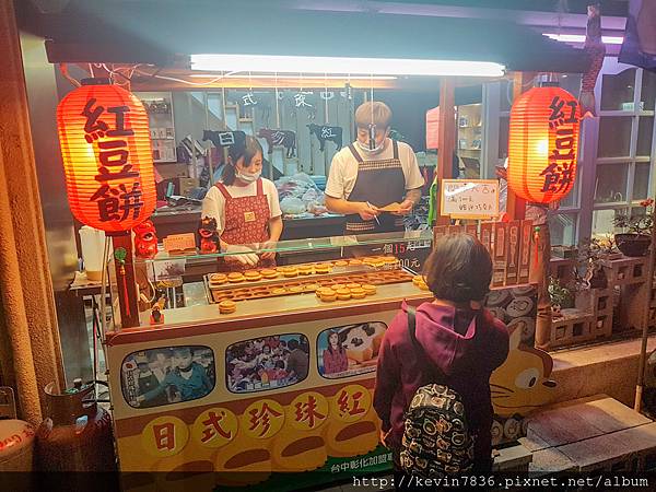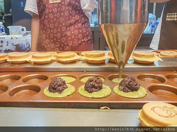 這紅豆餅攤車好可愛,還掛著一對大大燈攏寫著紅豆餅,老闆親切的說:紅豆餅七個100元,有七種口味,另外今天限量版口味是抹茶紅豆,聽完老闆解說後,我心裡已有答案,那就是六種口味全都來一顆吧!外加抹茶紅豆兩顆,點好後,梅子在旁耐心等待,現點現做所以需要一點點時間.