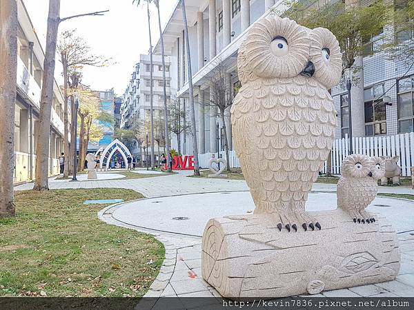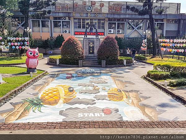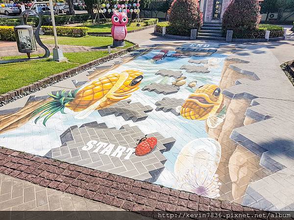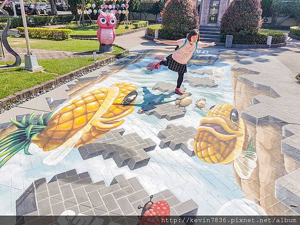 還有可愛貓頭鷹,這3D地景彩繪結合了當地農特產像是鳳梨.龍眼.荔枝等等,透過彩繪畫將鳳梨魚.荔枝瓢蟲.金針菇水母與龍眼金龜子等圖案,讓整幅畫發揮得生動有趣,讓我們一起來與畫互動拍照囉!GO~就在這,停車非常便利唷!
