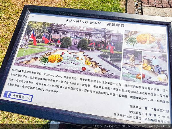 關於霧峰區公所的3D立體彩繪:以轟動全球的闖關活動(Running Man)為發想,並以當地景觀-雲霧繚繞的九九峰作為貫串全圖的背景,展現出(霧都)特色