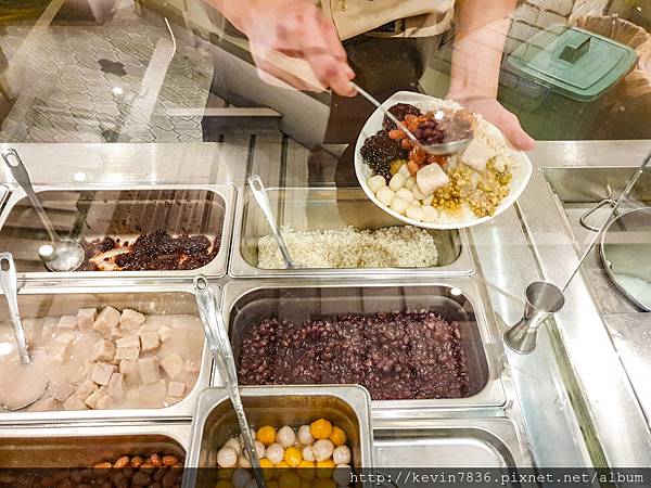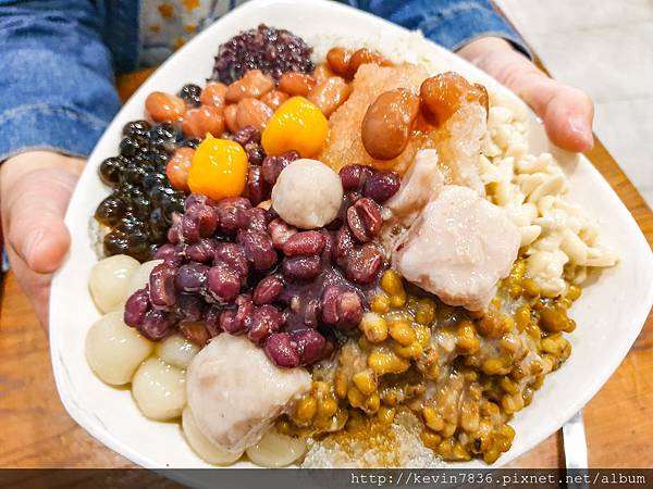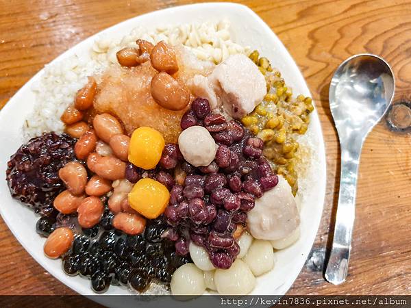 八寶冰:一端上桌時有被滿滿八寶冰驚艷到,梅子邊吃邊細數了一下有薏仁.綠豆.花生.紅豆.芋圓等多樣食材,吃得到薏仁清爽口感.綿密紅豆還有不小塊好吃的芋頭,一碗滿滿對於剛吃飽的我們,兩人分享剛剛好,分量果然十足.