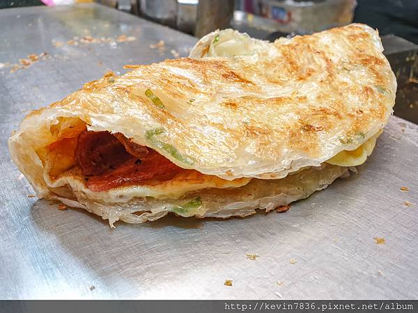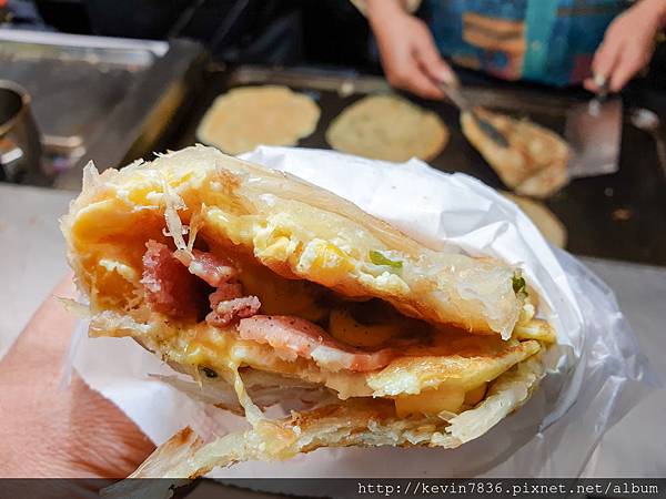 我們點了綜合版口味有培根.玉米與起司三種混搭在一起,等等大口吃蔥抓餅了