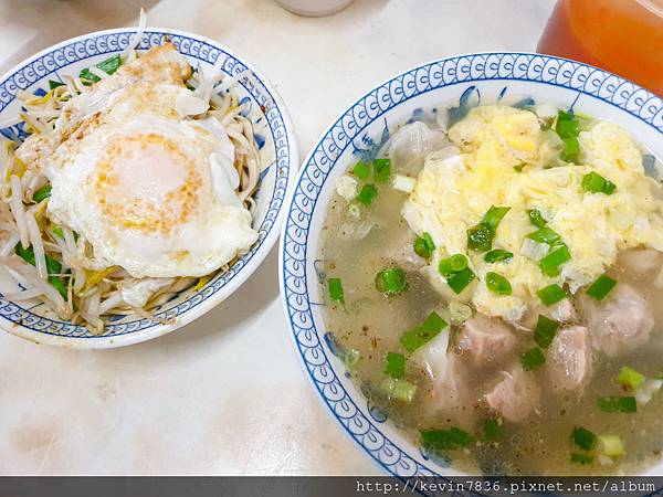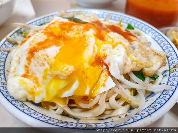 乾陽春麵+半熟荷包蛋:當我們輕輕畫開半熟荷包蛋時,那蛋汁緩緩流出,老爺把蛋汁與面攪拌再一起,再淋上店家的特製醬料,麵裡還有香氣十足的韭菜與豆芽菜,讓人喜歡一口又一口,果然,是店內人氣招牌