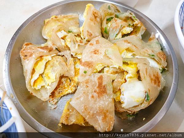 蛋餅:餅皮很特別微厚,裡面軟嫩口感,鐵盤裝著蛋餅很特別