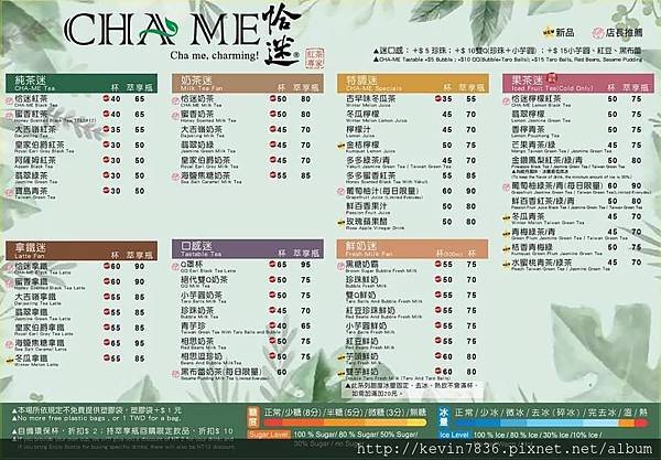 恰迷的MENU,品項眾多,有純茶.奶茶.特調.果茶.拿鐵.口感與鮮奶,Menu非常清楚一目了然,如果覺得杯裝喝不過癮,不用擔心,還有瓶裝,且瓶裝拿空瓶來時,還可以折抵十元,非常貼心唷!