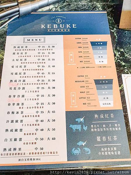可不可熟成紅茶台中三民店的MENU,一整個超有質感的點單,MENU旁邊還會有糖度與冰塊附上圖文說明,更有趣的是飲料名稱下也有小排紅字說明,比如:熟成檸果整顆檸檬搭配七分糖最佳,那梅子就來點杯熟成檸果七分糖來試喝一下,晚點再跟大家分享心得