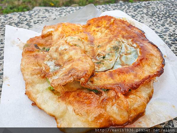 哇!拿到時還是熱騰騰的蔥油餅時,老爺形容餅皮帶著香氣與酥脆口感,內餡更不用多說,有著蔥花與九層塔的多層次口感,加著店家特調醬料,嘴裡吃著蔥油餅坐在階梯上,看著眼前美麗風景,吹著涼涼的微風,真是心滿意足,不愛蔥花的梅子就只能欣賞眼前美景了.