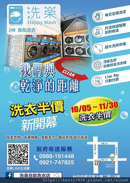 10/5~11/30新開幕洗衣半價優惠,每天定期清潔,也有代洗烘摺服務到府收送,可以直接私訊粉絲頁或Line官網
