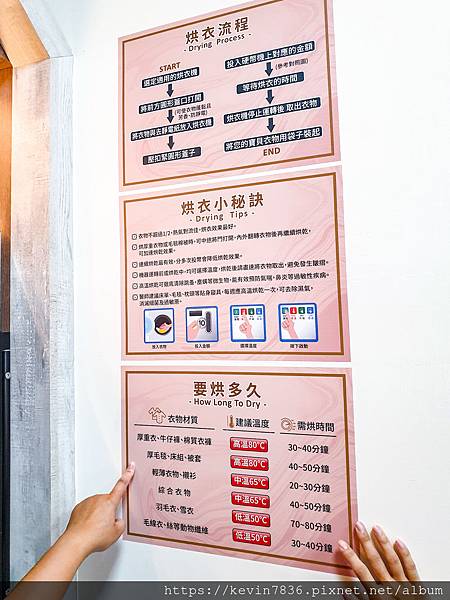 牆上也有烘衣流程,烘衣小秘訣,還有還有告訴你什麼樣質料的衣物或棉被等要烘多久,這也太周到了,就感心(念台語,哈哈)
