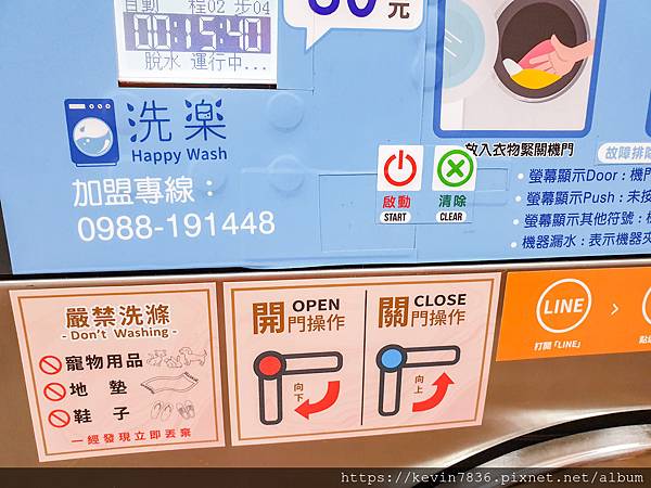 洗衣機上都有圖文操作流程說明,梅子幫大家畫重點:記得門把一定要關緊,投完錢幣就可以按啟動