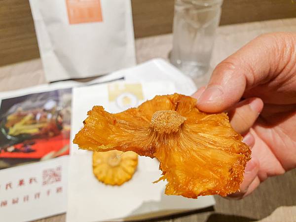 金陽鳳梨花果乾一打開時,鳳梨香氣十足,還有果肉細緻,在嘴裡酸甜滋味獲得老爺喜愛,大大擄獲老爺味蕾
