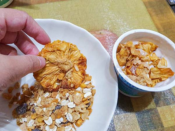 今早在老爺提議下,把鳳梨果乾切成丁,跟著燕麥一起加進時,哇!讓優格風味更佳