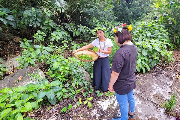 親切美麗的老師,再煮搖搖飯前,還會帶著我們到花園走走看看不同野菜,比如:艾草、檳榔葉俗稱老葉,月桃葉等等,老師還會讓我們用手觸摸與體驗,重點:老師問了很多植物名稱,老爺幾乎完全答對,梅子我似乎全都答錯,但過程中有趣又好玩
