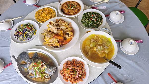 桌上餐點都是在地友人點的,餐點看起來超級澎湃又豐盛,讓我先介紹餐點名稱吧!烤雞、剝皮辣椒煎蛋、珍珠石斑魚、彩椒茄子、高麗菜乾滷肉、鹹酥炸溪蝦與老菜脯雞湯,邊介紹時,梅子我早已經準備好大快朵頤一番,香氣四溢的餐點讓我垂涎欲滴,話不多說,友人呼喊著我快快用餐,趁熱吃最好吃了,晚點再與大家分享,餐點的美味了