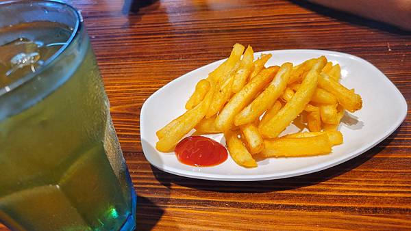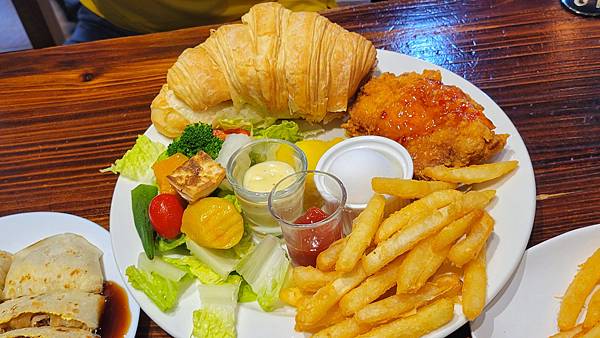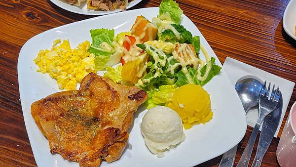 田園滿福餐~這一整盤超級豐盛,友人邊吃邊細數這整盤的食材有:泰式風味炸雞腿排、生菜沙拉、薯泥、水煮蛋、炸薯條以及可頌麵包,友人描述泰式風味炸雞腿排一口接一口時,喜歡雞肉外皮酥脆的口感,搭配著雞肉鮮嫩多汁,帶點清香中又伴著微酸微辣口感吃起來超過癮,友人一邊吃一邊讚不絕口,重點:還沒有整盤吃完飽足感就出來了,份量真的很夠啊!