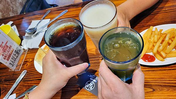 樹頂蜜桃烏龍茶、紅茶以及薏仁木耳,三款飲品裡面樹頂蜜桃烏龍茶是我們倆喜歡的,一入口有著濃郁蜜桃汁,搭配淡淡烏龍茶多層次口感,微糖冰涼好好喝,早午餐吃完一整個無敵飽足,跟友人一起乾杯,棒