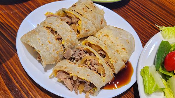 梅花豬肉洋蔥粉漿蛋餅~老爺特地給梅花豬肉洋蔥粉漿蛋餅特寫鏡頭,一口咬下去時,蛋餅餅皮外酥內軟,蛋餅裡包了滿滿的梅花豬肉與洋蔥超豐盛的配料,讓我們三個人吃完後,覺得好飽足唷!