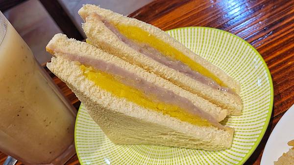 芋泥地瓜土司~這餐點友人很喜歡,看看裡面竟然有芋泥與地瓜二種內餡,友人形容,一口咬下去味蕾裡有著滿滿的芋頭香、還吃的到整塊芋頭,伴隨而來地瓜甜而不膩口感,太特別了。