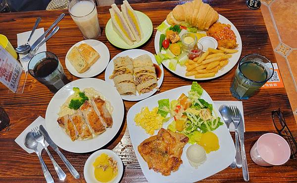 我們桌上餐點就在我們聊聊彼此近況時,餐點一一出爐:芋泥地瓜土司、梅花豬肉洋蔥粉漿蛋餅、田園滿福餐、香煎雞腿佐蘑菇義大利麵(附餐:堅果地瓜泥)、匈牙利雞腿(有附手工蔥麵包、套餐都有附贈一杯飲品),哇塞!餐點一一呈現在我眼前時,讓我眼睛為之一亮,每款早餐份量豐盛十足,讓我們三個人都驚呆了,餐點太好拍,讓我們忍不住一直猛拍照,最後,梅子直呼受不了被香氣四溢餐點誘惑,我們準備大快朵頤一番,晚點再跟大家描述我們喜歡的口感心得分享~