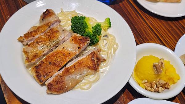 香煎雞腿佐蘑菇義大利麵(附餐:堅果地瓜泥)~這餐點是梅子的,我愛慘這道餐點,有一種完全想自己吃完,不想留給老爺吃幾口的心情(哈哈!),義式香煎雞腿排(一口咬下時,超愛外皮酥脆的口感,肉質超級嫩與濃濃的香氣真的很讓人一口接一口)、用鮮奶熬煮蘑菇醬,一點不膩口,麵條也很美味,最後,我還是有跟老爺分享,然後,露出無比滿足笑容,直呼超好吃