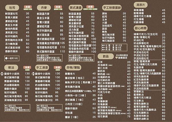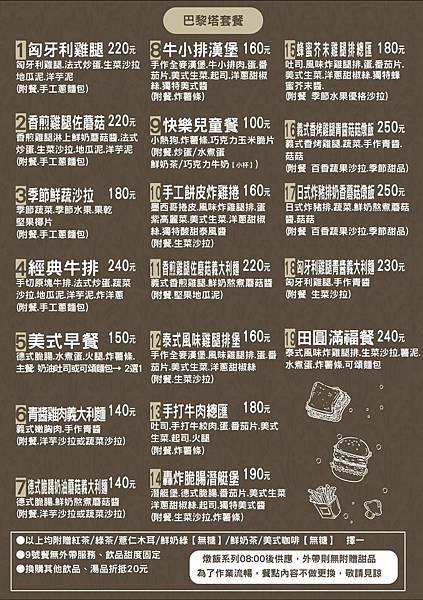 巴黎塔早午餐的餐點吐司、軟法、丹麥、手工漢堡、英式漢堡、手工粉漿蛋餅、炸物單點、飲品、湯厚片以及甜心時間,總共有19種套餐,選擇非常多樣化,餐點都是現點現做,採半自助式的用餐方式,沒有收服務費唷!