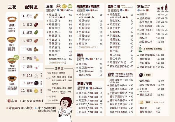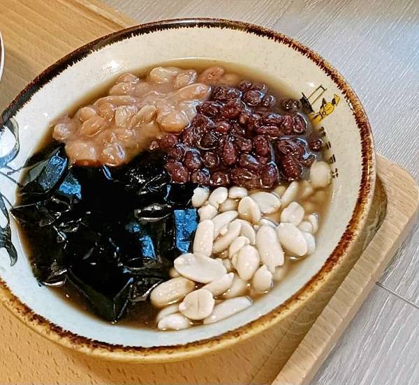 綜合燒仙草:微涼的天氣就愛來碗熱呼呼嫩仙草,這一碗裡吃得到入口即化的北港花生、鬆軟香甜紅豆、香甜又綿密的彎豆,再搭配著綿密Q溜嫩仙草,熱熱吃每一口都好滿足