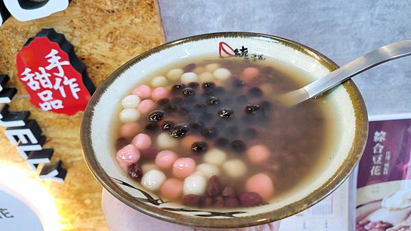 綜合豆花:芋圓、紅豆以及湯圓,老爺直呼這一碗讓他非常愛,這一碗配料超速配,吃得到超Q的芋圓,鬆軟香甜紅豆以及彈牙的Q軟湯圓,哇!一整個吃完飽足感都有了,超尬意的啦~