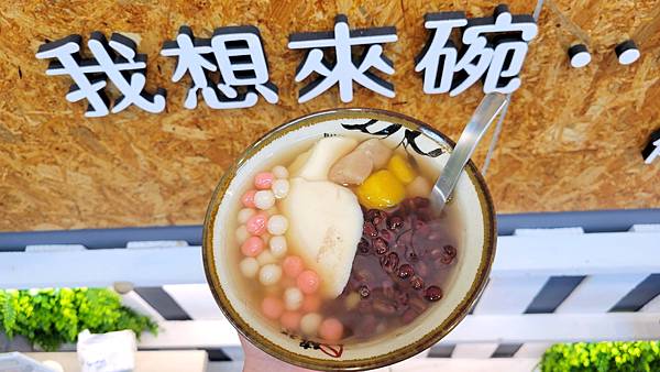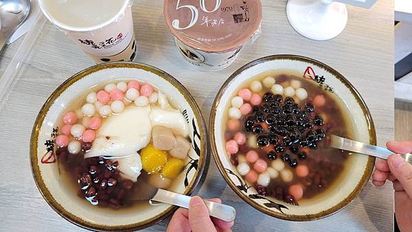 芋圓豆花:老爺邊吃邊露出滿足笑容描述這碗芋圓豆花裡吃得到超Q的芋圓,還可以品嚐到芋頭及地瓜的香氣,整碗吃起來微甜剛剛好