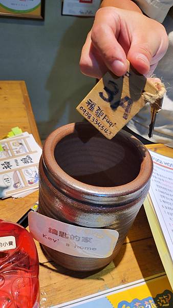 櫃檯桌上有著鑰匙的家,退房時,別忘了鑰匙可以放進去筒子裡唷…
