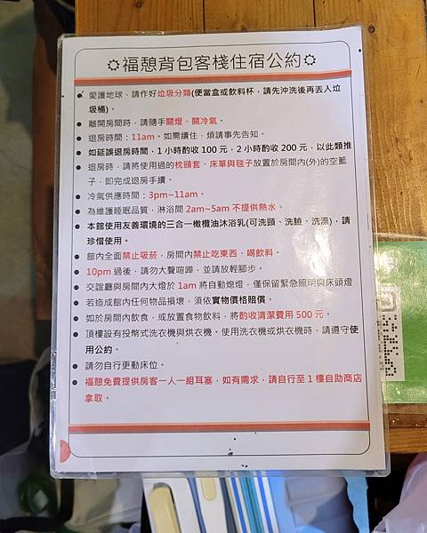 福憩背包客棧住宿公約:公約項目非常清楚,一目了然