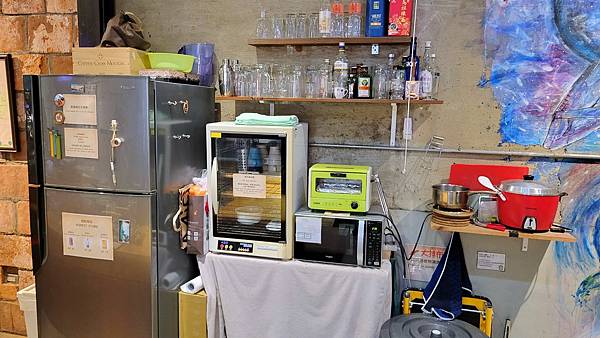 開放式廚房:冰箱裡也有提供飲料或者啤酒(冰箱也是自助商店),大小烤箱、大同電鍋,以及各式各樣杯子通通有提供,在這裡吃完自己買回來的餐,記得碗盤要洗乾淨,放烘碗機,以方便其他房客使用唷…