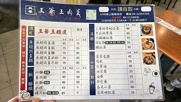 王爺王肉羹菜單:魚翅肉羹類、飯.麵類、湯類以及小菜與飲料,價錢還蠻合理的。
