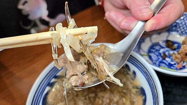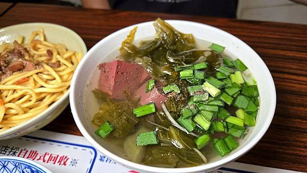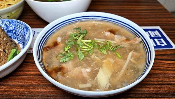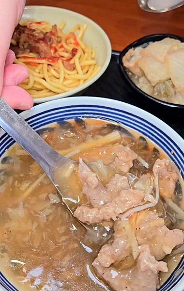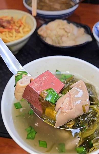 綜合湯:老爺點的,湯裡頭超多配料,有小腸、大腸、隔間肉以及豬血,老爺一口接一口邊喝邊開心描述配料好多,湯頭不死鹹,整碗湯喝起來很涮嘴,讚啦!