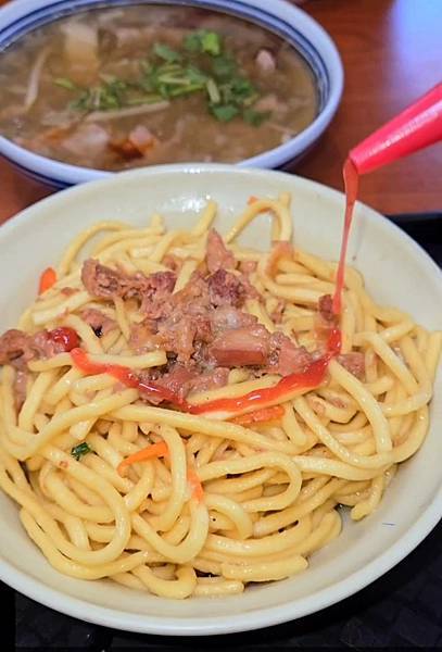 炒麵:淋上許多肉燥以及蒜泥,再搭配少許甜辣醬,麵條吸附了肉燥香氣後,每一口都超涮嘴,吃起來鹹香口感,讓我們倆都非常喜歡