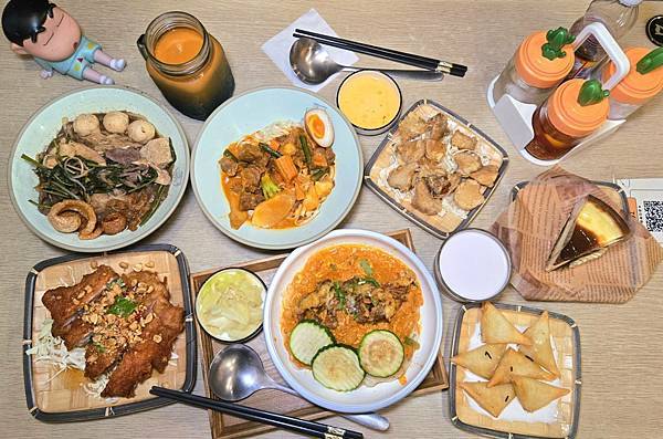 我們倆點了,船麵牛肉、瑪莎曼牛腩麵、咖喱軟殼蟹拌麵 、炸杏鮑菇、椒麻雞腿榴蓮酥佐椰奶、泰式奶茶以及摩摩喳喳,餐點現點現做,等待餐點同時,梅子與老爺話家常,討論生日當天我們還要去哪吃喝遊玩,就在歡樂氣氛中餐點一一出爐囉…哇!香氣四溢迷人味道,讓我忍不住想食指大動一番,期待老爺餵飽相機,我們就準備開動啦!