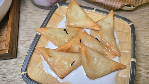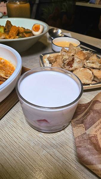 榴蓮酥佐椰奶:這甜點表現比較中規中矩,外層酥皮金黃,一入口先味蕾裡有榴蓮餡淡淡綿滑、熱熱的榴蓮餡在口中化開時,椰奶的清香順勢溫柔包覆,這道甜點比較沒有太多驚喜,如果,內餡榴槤味更濃郁,就更棒了。