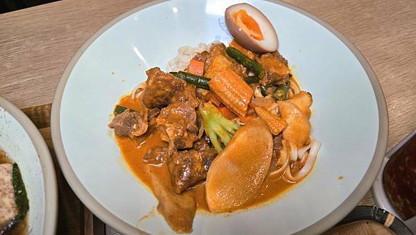 瑪莎曼牛腩麵--紅咖哩搭配牛腩:梅子細數一下配料食材有,糖心蛋、南瓜、四季豆、玉米筍、花野菜洋蔥、胡蘿蔔丁……等,梅子喜歡椰奶香濃順口湯頭,孜然、肉桂等香料層次豐富,微辣挺不錯,當梅子一口接一口牛腩時,哇!好美味,牛腩帶點筋、入口軟彈,完全吸飽咖哩香氣我一個人獨享這碗餐點,有喜歡啦!