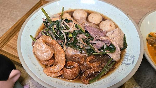 船麵牛肉:牛肉肉質軟嫩滑口、吸附湯汁,裡頭還有配料食材:杏苞菇、豆芽菜、空心菜、河粉、炸豬皮、四季豆、魚丸等,配料還蠻豐富,品嚐湯頭前,梅子先品嚐原味湯頭,再搭配四寶醬:醋、辣椒粉、魚露、糖,口感濃郁又帶點清爽層次,是我個人喜愛的口感