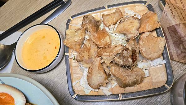 咖喱軟殼蟹拌麵--老爺蠻喜歡這份餐點,他邊吃邊撈,餐點裡頭有蛋、軟殼蟹以及椰奶。