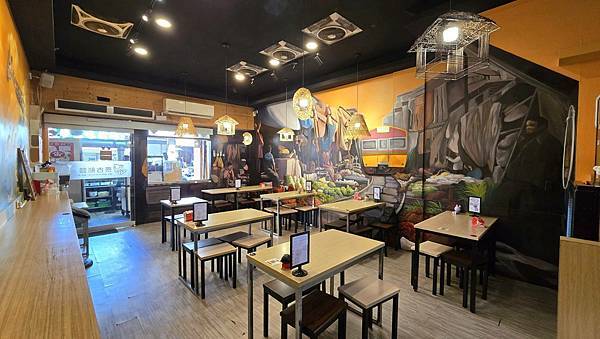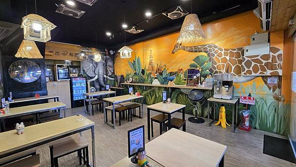 推開門瞬間,牆上畫風讓我們倆讚嘆不已,非常逼真巨大大象與長頸鹿,讓老爺忍不住多拍幾張,真的太好拍了,我們再來看看另一面牆畫風,最吸睛的就是整面大型畫作,描繪的是泰國非常知名的美功鐵道市集氛圍,包含:亮黃色車頭的火車、市集攤販與蔬果、市場小販、當地居民……等,店內乾淨整潔用餐環境,溫馨舒適用餐空間,有提供二個人到四個人座位,週末假期如怕人多,可以打電話預訂座位唷…