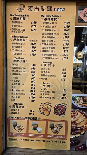 泰古船麵菜單:泰味船麵、經典泰飯(含3樣配菜)、泰典小食、開胃小食、泰味麵食、飲料以及甜點,還有主餐加購,還可以調整辣度;主打平價又道地泰式料理,無論是人氣經典船麵、濃郁湯頭還是香辣開胃的泰式風味,都讓人喜歡。