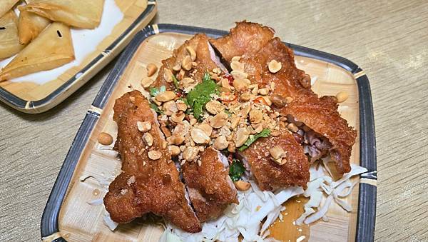 椒麻雞腿:這盤餐點獲得我們倆一致喜歡,外皮炸得酥香微脆,帶點椒麻醬汁包覆後的微微濕潤感;雞腿肉本身飽滿紮實,一咬下去吼吼吼~~鮮嫩多汁,椒麻醬的酸、麻、微辣在味蕾裡慢慢散開,雞腿的鮮甜更佳明顯,會讓人越吃越涮嘴。